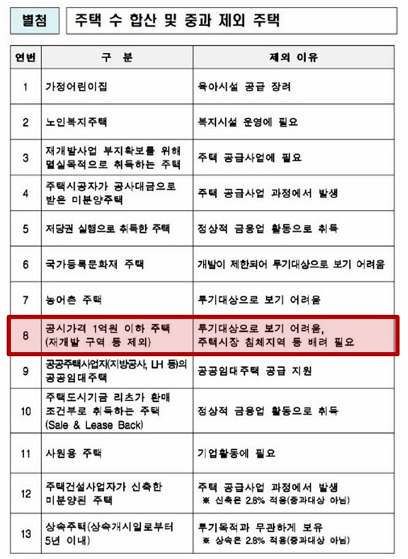 주택 수 합산 및 중과 제외 주택은 아래에서 자세히 확인해볼 수 있다. 8번째에 있는 공시 가격 1억 원 이하 주택은 투기대상으로 보기 어려워서 주택시장 침체지역 등 배려가 필요하여 주택수 합산 및 중과 제외 주택이 되었다.