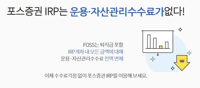 IRP의 뜻은 개인형 퇴직연금이다. 수수료가 다른 기관보다 적은 포스증권에서 계좌 개설을 하기로 하였다. 포스증권의 예전 이름은 펀드슈퍼마켓이었다. 온라인에서 펀드를 팔아서 지금은 포스포리아, 포스증권으로 이름을 변경하였다.
