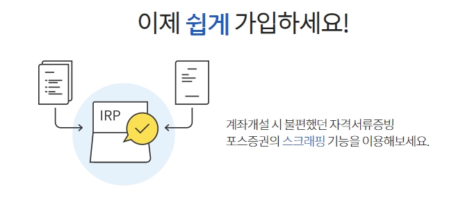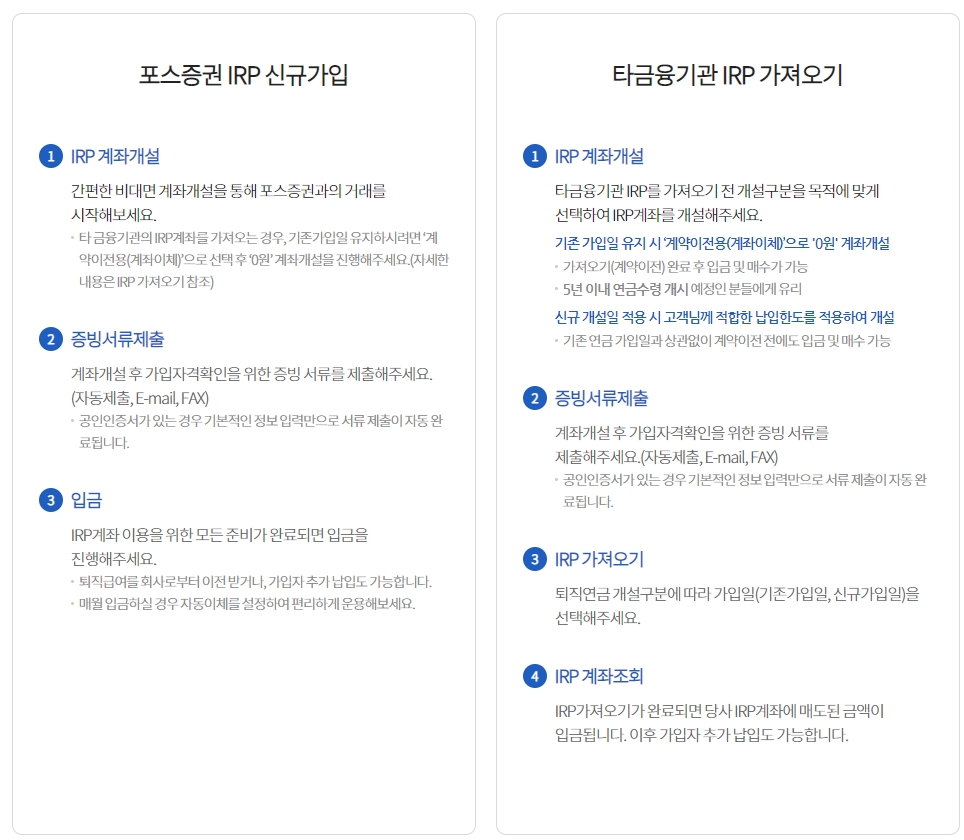 포스 증권 IRP를 신규 가입하는 방법과 타 금융기관 IRP를 가져오는 방법이 있다.