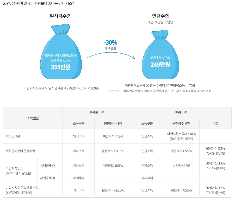 개인형 퇴직연금의 세제 혜택은 연금 개시 전 후로 달라지다. 또한 퇴직금을 연금 수령 11년차부터는 40%가 감면된다.
