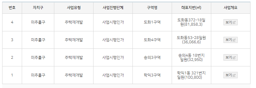 | 3 | 미추홀구 | 주택재개발 | 사업시행인가 | 도화4구역 | 도화동53-28일원(36,066.6) |
