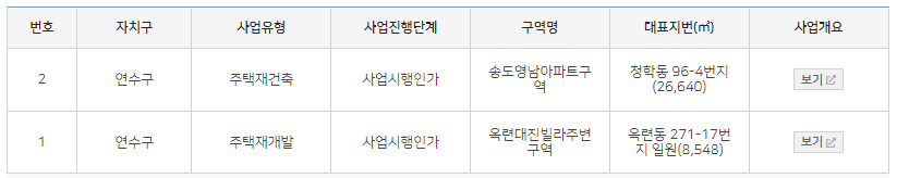 | 2 | 연수구 | 주택재건축 | 사업시행인가 | 송도영남아파트구역 | 청학동 96-4번지(26,640) |