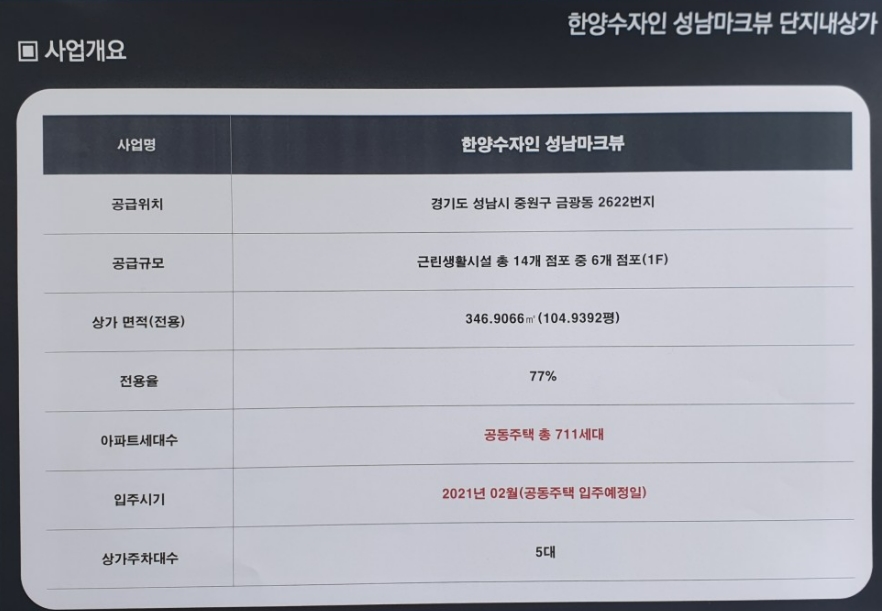 경기도 성남시 한양수자인 성남 마크 뷰 단지 내 신축 상가이다. 이 자료는 2021년 것으로 현재는 상가 분양이 끝난 상태이다. 한양수자인 성남 마크 뷰는 경기도 성남시 중원구 금광동 2622번지에 위치한다.