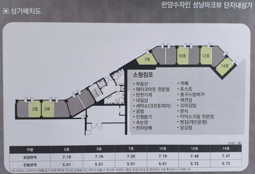 단지 내 상가의 배치도를 보면 아래와 같다. 소형 점포는 14호까지 있다. 추천 점포는 부동산과 세탁소 반찬가게, 네일샵, 속눈썹, 전자담배, 카페, 토스트 등등 다양한 업종이 있다.