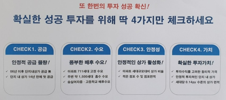 아파트 단지 내 신축 상가는 매매가나 분양을 받는다면 가격이 어떻게 될까? 2억 상가인 동네가 있다. 이 상가 홍보지에 따르면 아래와 같은 투자 성공의 확신 단지라고 한다.