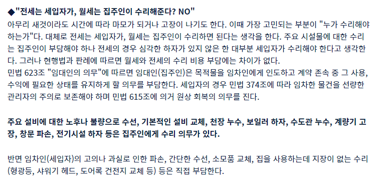 임대차 계약이 전세이든 월세이든 임차하여 살고 있는 문제가 생기면 집의 설비에 관한 수리인 천장 누수, 보일러 하자, 수도관 누수, 계량기 고장, 창문 파손, 전기시설 하자 등은 집주인이 수리한다.