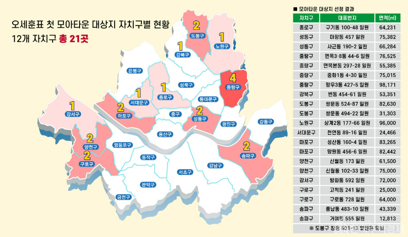 서울시가 지난 6월 모아타운 대상지 발굴 자치구 공모 결과 도시재생활성화지역 6곳을 포함해 총 21곳을 선정했다.