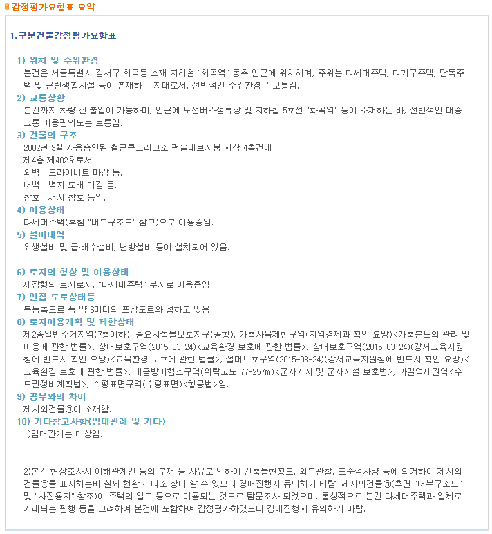 다음으로 감정평가요항표를 살펴보자. 화곡동 빌라는 2002년에 지어진 빌라로 화곡역인근에 위치하고 있다. 외벽은 드라이비트로 마감한 빌라이다. 임대관계는 미상이라고 한다.