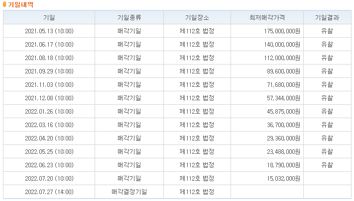 서울시 화곡동 빌라의 기일내역은 다음과 같다. 매각기일은 7월 20일이고, 최저매각가격은 15,032,000원이다. 화곡동 빌라가 여러번 유찰이 되어 가격이 낮아졌다. 본 물건에 관심이 있다면 7월 20일에 서울남부지방법원 112호 법정에 가면 된다.