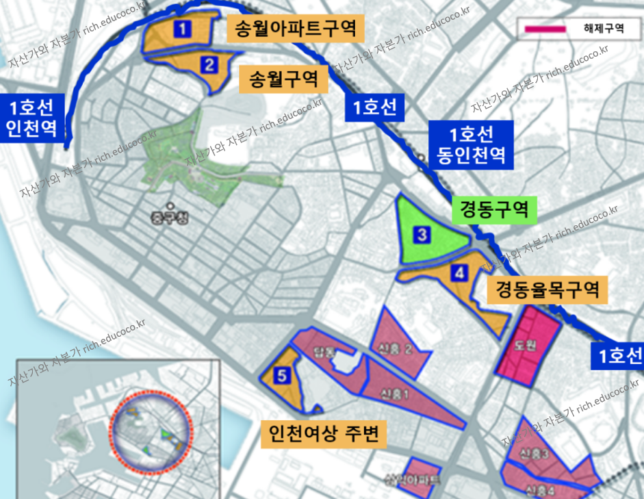 노랑색은 1번과 2번은 주택 재개발사업으로 1번은 송월아파트 재개발구역이고, 2번은 송월 재개발구역 4번은 경동율목구역 5번은 인천여상 주변이다.