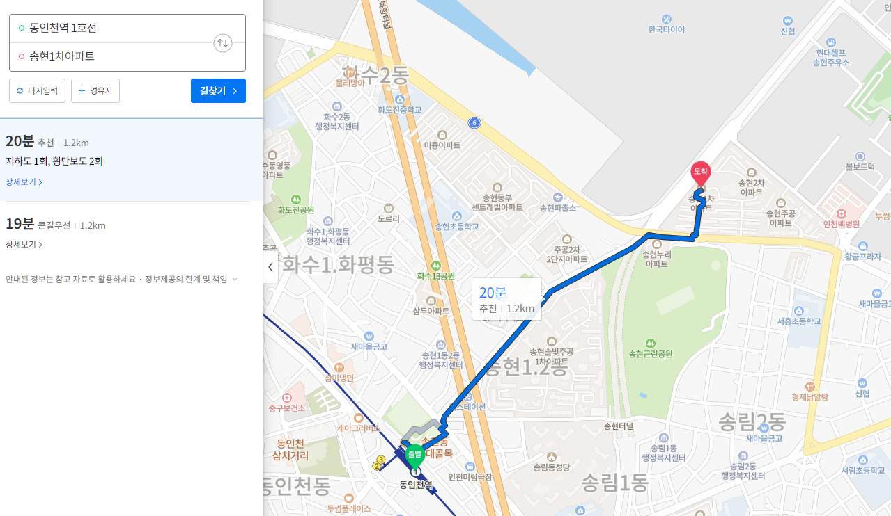 송현 1차 아파트는 동인천역에서 버스를 타고 10분이 걸린다. 도보로 20분이 걸린다. 걸어서 역에 다니기에는 조금 무리가 있다.