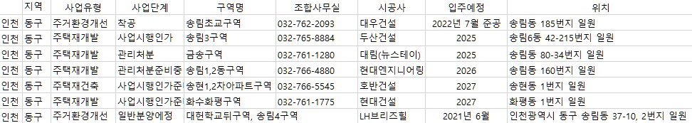 인천 동구청 홈페이지에 재개발 구역을 확인할 수 있다. 동구 주택 재개발과 재건축, 주거환경개선 사업이 이루어지고 있다. 입주예정일은 말 그대로 예정일이니 단순 참고용으로 생각해야 한다.