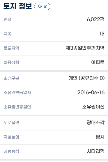 다음은 디스코에서 가져온 토지정보이다. 화수동 미륭아파트 토지면적은 6022평이고, 용도지역은 제3종 일반주거지역임을 확인할 수 있다.